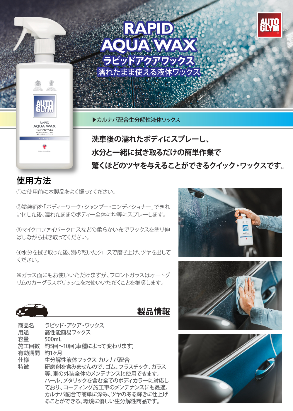 簡単作業で驚くほどのツヤ【ポイント20%還元】オートグリム ワックス 車 液体ワックス ラピッド・アクア・ワックス 簡単 濡れたまま使える カルナバ配合 正規輸入品 20AAW500JP AUTOGLYM 20AAW500JP