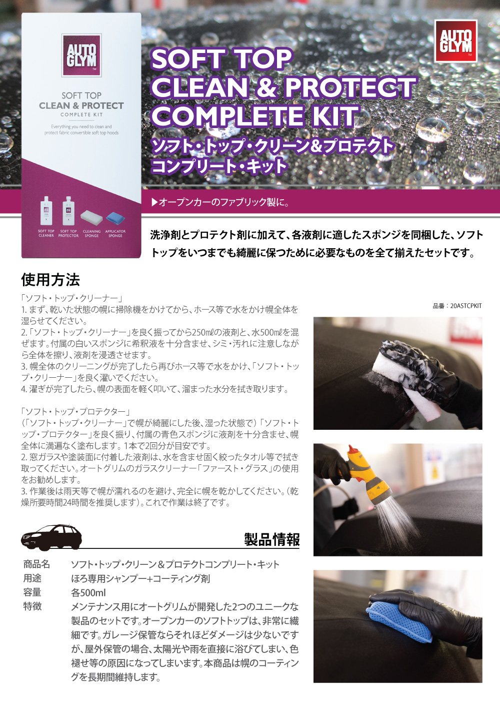 トップ > 自動車用ケミカル > 【ポイント20%還元】オートグリム 車 幌 ほろ クリーナー コーティング 保護 ソフト・トップ・クリーン&プロテクト コンプリート・キット 正規輸入品 20ASTCPKIT AUTOGLYM 20ASTCPKIT