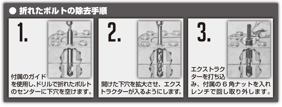 破損したボルトのセンターにドリルで穴をあけ、そこへエクストラーを打ち込み、6角のナットを使いボルトを取ることが出来ます。